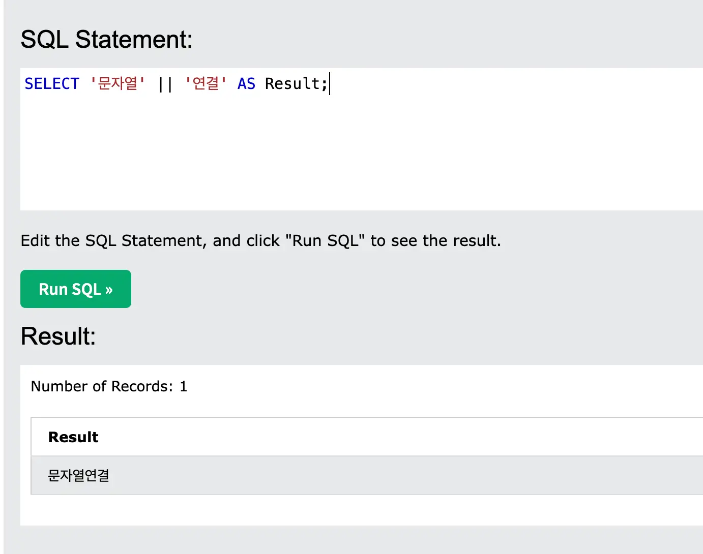 SELECT '문자열' || '연결' AS Result;