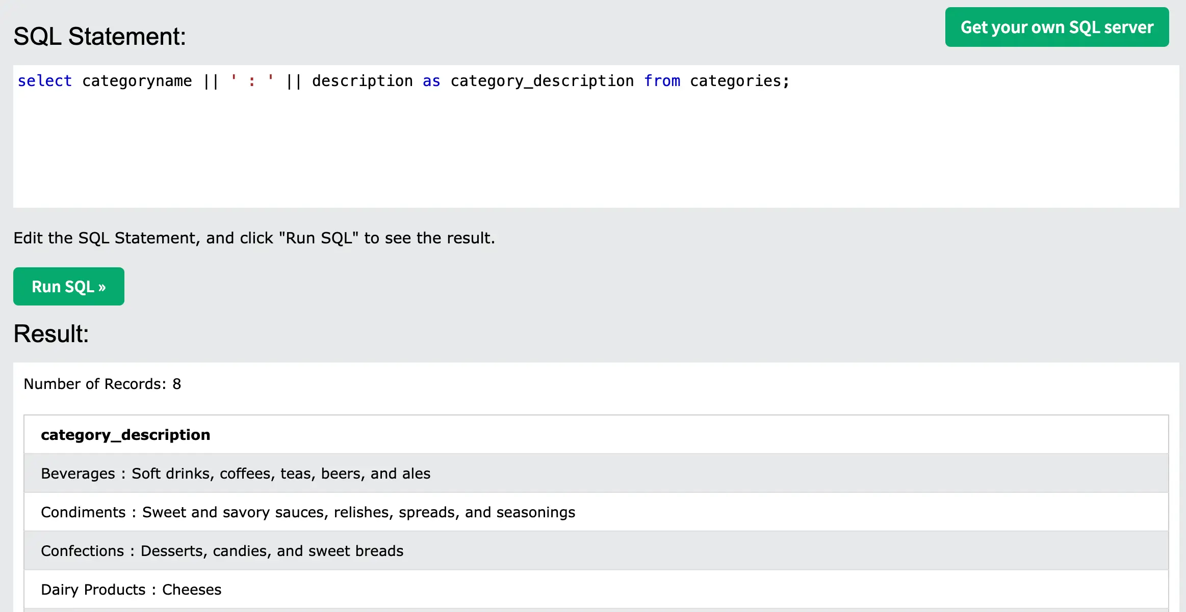 select categoryname || ' : ' || description as category_description
