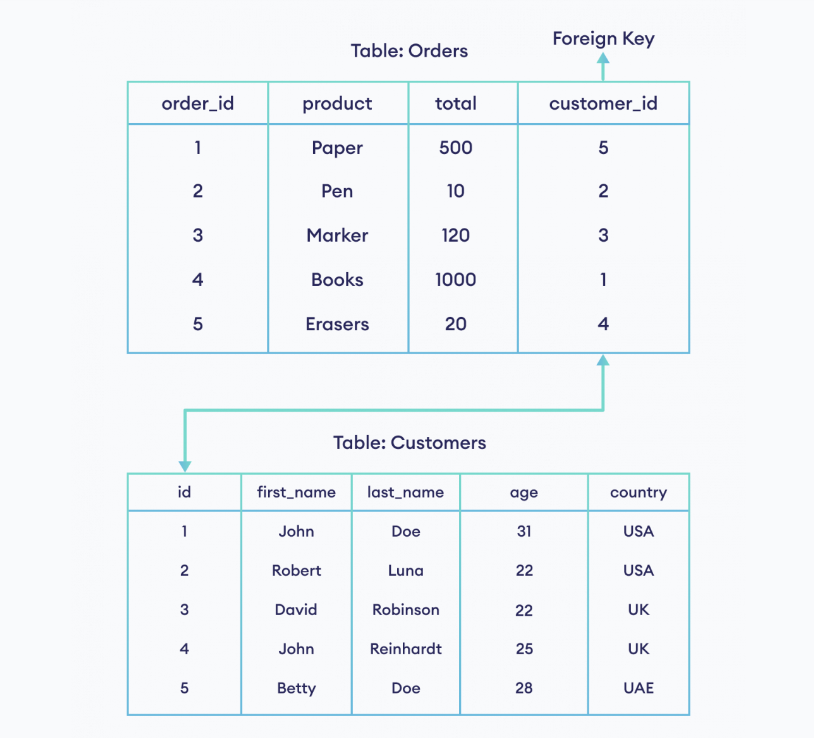 외래키는 한 테이블의 컬럼이 다른 테이블의 기본키를 참조하는 경우 사용됩니다. 예를 들어, 온라인 쇼핑몰의 고객 정보 테이블(customers)과 주문 테이블(orders)이 있다고 가정합니다. 고객 정보 테이블의 기본키는 id입니다. 주문 테이블의 기본키는 order_id입니다. 이때 고객 정보 테이블의 기본키인 id를 주문 테이블의 외래키로 지정해서 테이블을 연결할 수 있습니다.